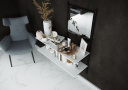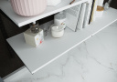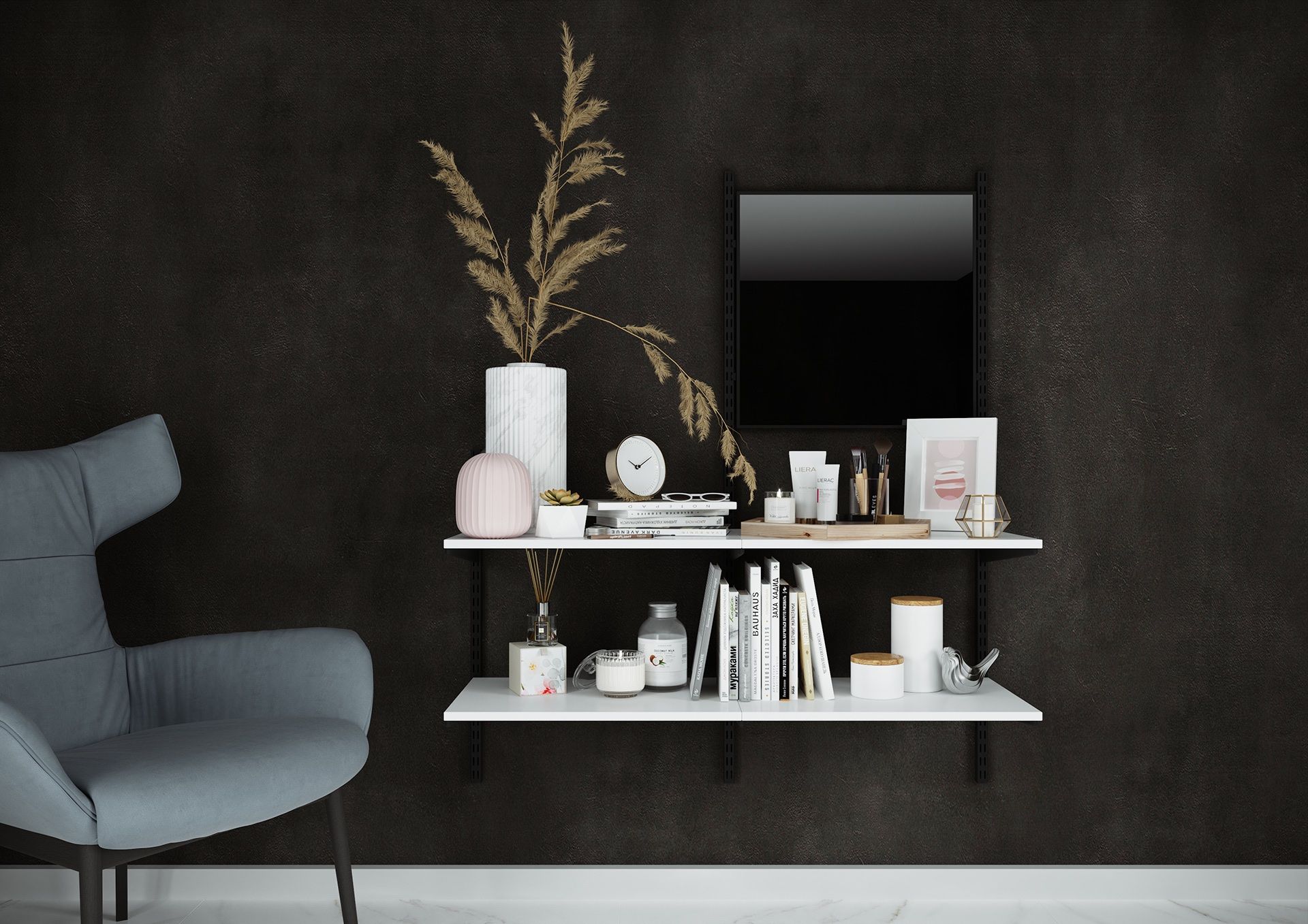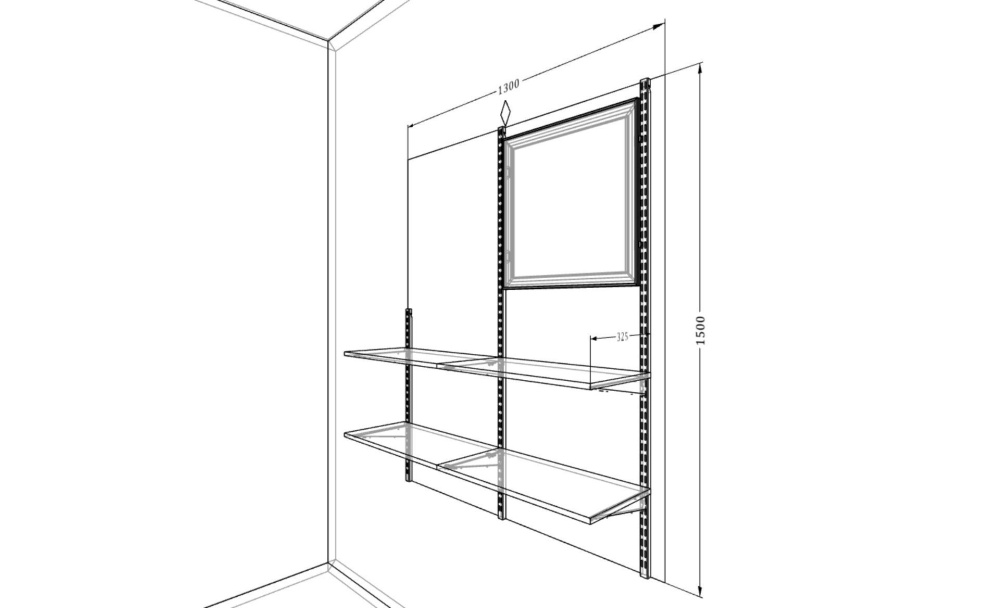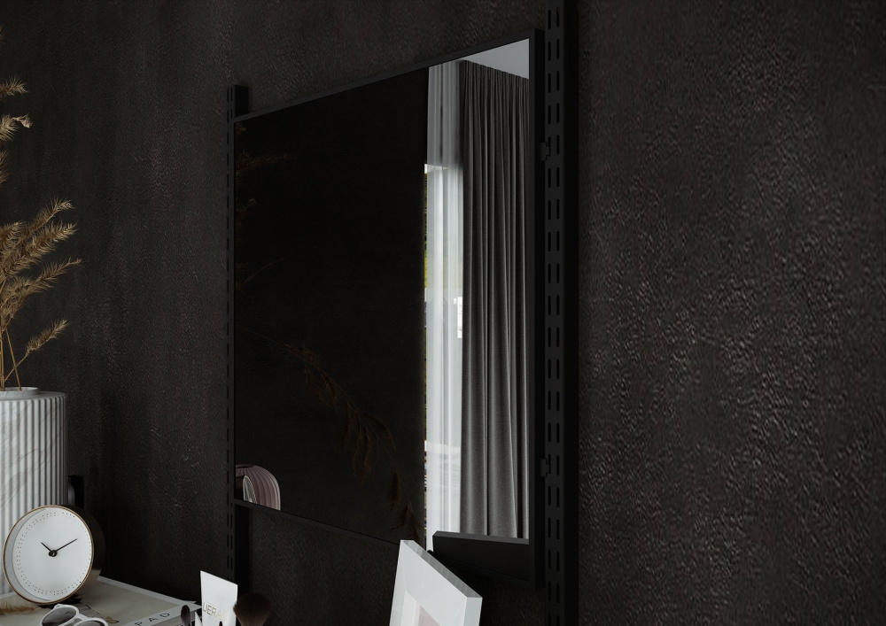 Полки навесные из ЛДСП 16 мм Белый Премиум и зеркало в рамке фиксируются на черных кронштейнах, которые крепятся к металлическим направляющим на удобной высоте.