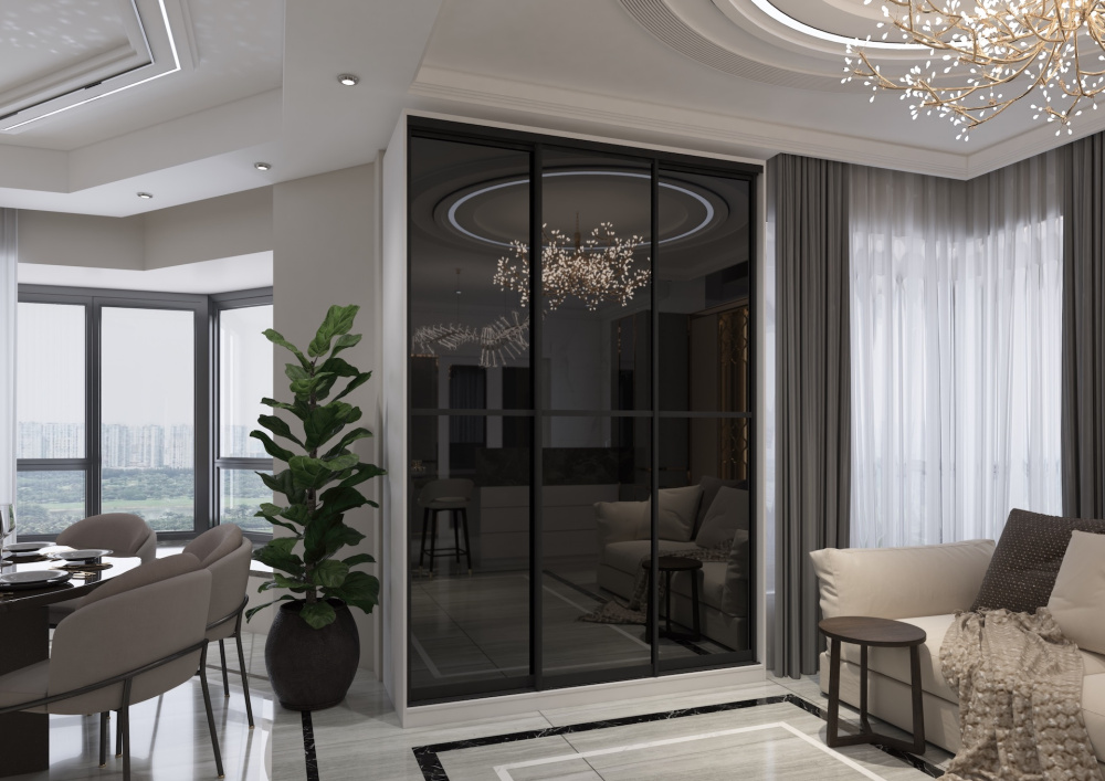 Двери-купе выполнены в профиле «С» цвета «Черный кашемир» от ARISTO.