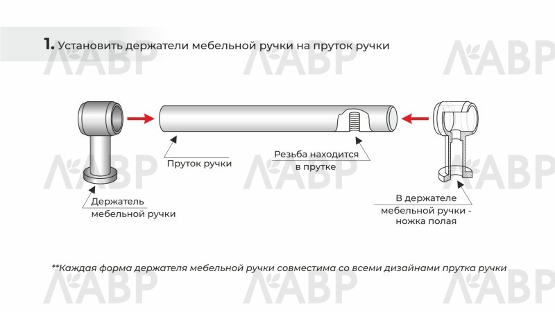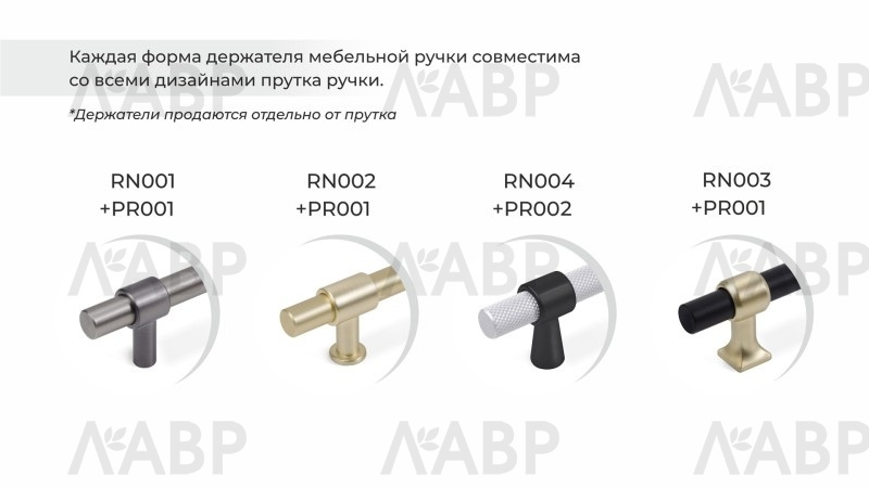 Диаметр отверстия в держателе RN002 рассчитан четко под прутки CUSTOMIZE (NUDE PR001, ROMB PR002, LINE PR003). После закрепления на фасаде готовая ручка стабильно фиксируется в одном положении и не «люфтит» в процессе эксплуатации.