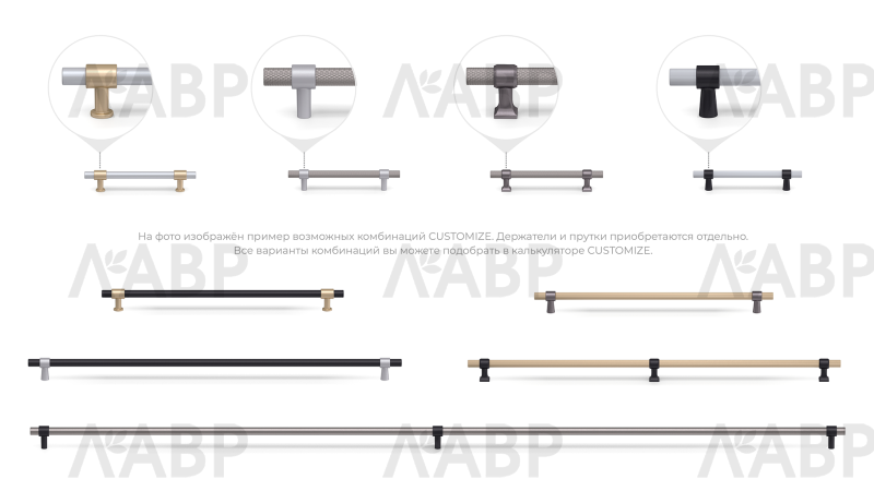 CUSTOMIZE – это серия кастомных ручек, которые клиент создает сам под свой авторский мебельный проект. 4 дизайна держателя мебельной ручки, 3 дизайна прутка, множество длин, трендовые оттенки – всё это открывает огромный простор для стильных творческих экспериментов.