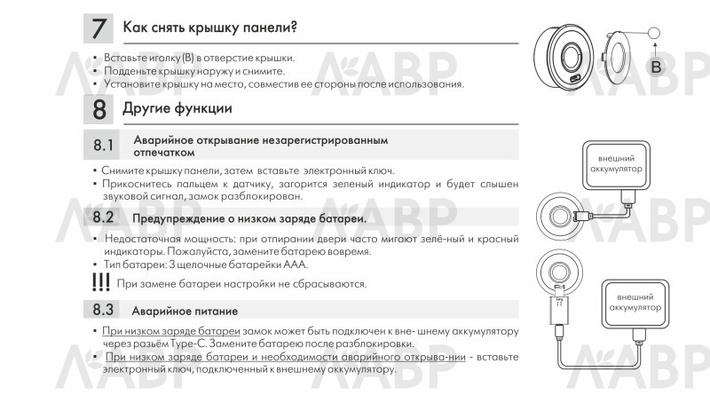 Модель обладает высокочувствительным быстро реагирующим биометрическим датчиком. К замку можно настроить до 20 отпечатков пальцев. До момента настройки замок может открыть любой отпечаток.