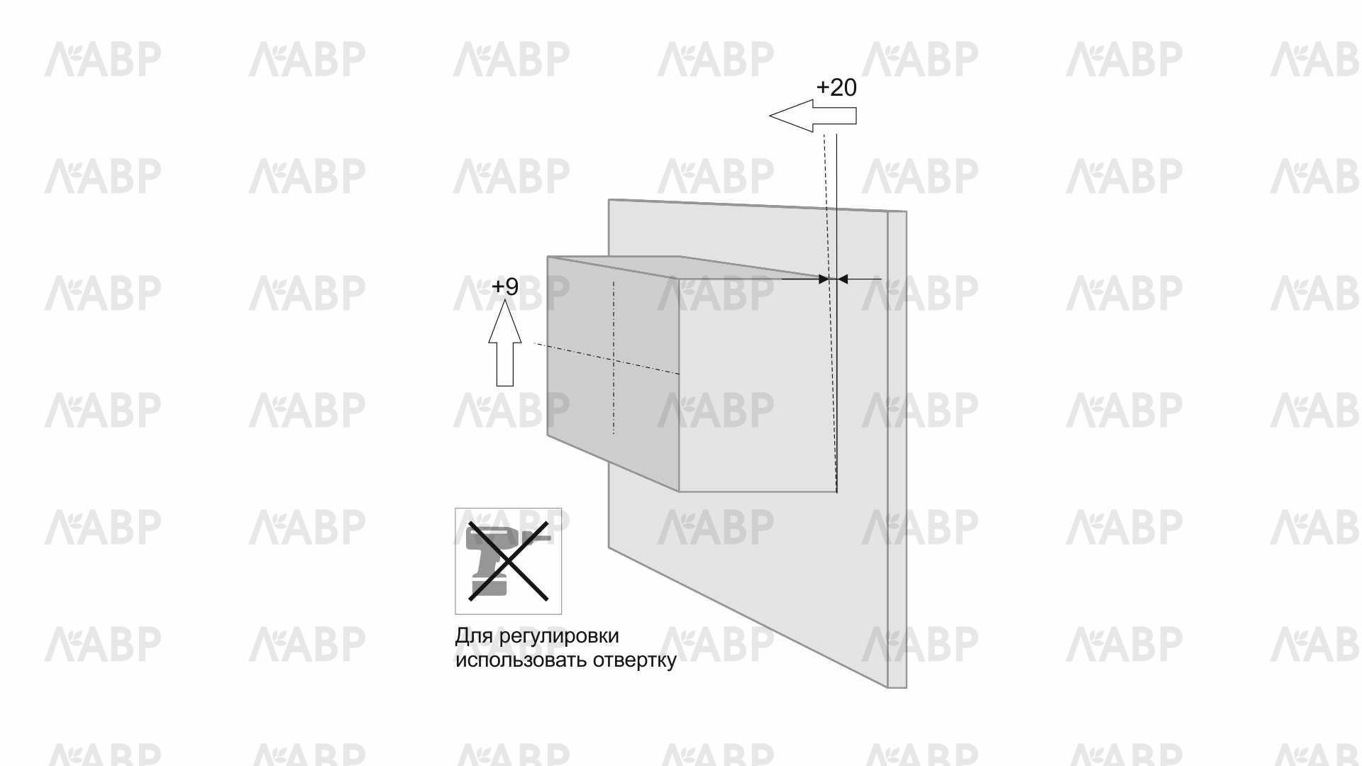 Модель устанавливается на боковых стенках внутри мебельного корпуса в заранее просверленные отверстия в плите. Футорки навеса (являющиеся частью его корпуса) легко соединяются с проделанными отверстиями и затягиваются с помощью саморезов, надёжно фиксируя CH07 на плоскости в четырёх точках, что обеспечивает высокую надёжность крепления. При помощи болтов на корпусе навеса, производится регулировка расстояния от короба до стены + 20 мм и положения по высоте + 9 мм.