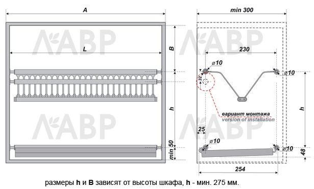 Сушка для посуды двухуровневая, быстрого монтажа (в предварительно просверленные отверстия). Стальной поддон. Материал – нержавеющая сталь, пластик.