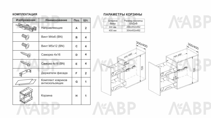 В комплекте: корзина, комплект направляющих, комплект держателей фасада, комплект ковриков противоскользящих, весь необходимый крепёж, инструкция.