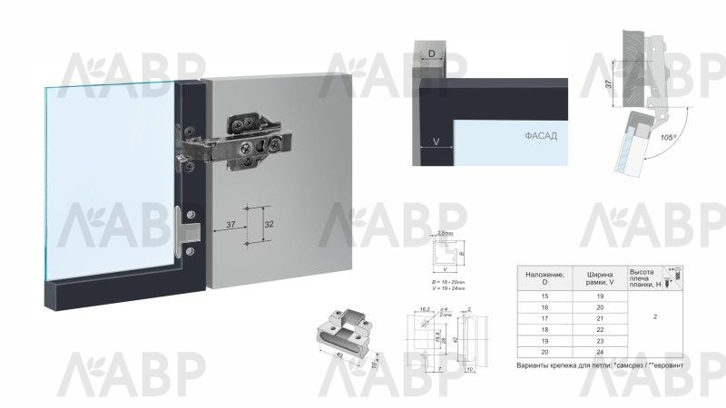H663 — одноходовая мебельная петля с амортизацией для накладных фасадов из алюминиевого профиля толщиной не менее 2 мм.