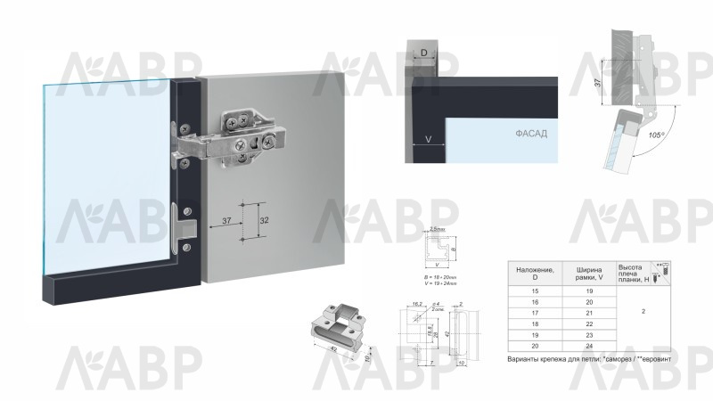 H663 — одноходовая мебельная петля с амортизацией для накладных фасадов из алюминиевого профиля толщиной не менее 2 мм.
