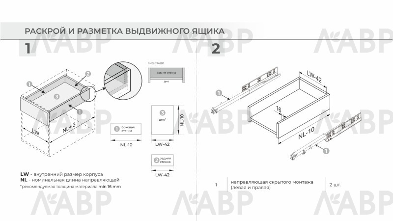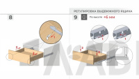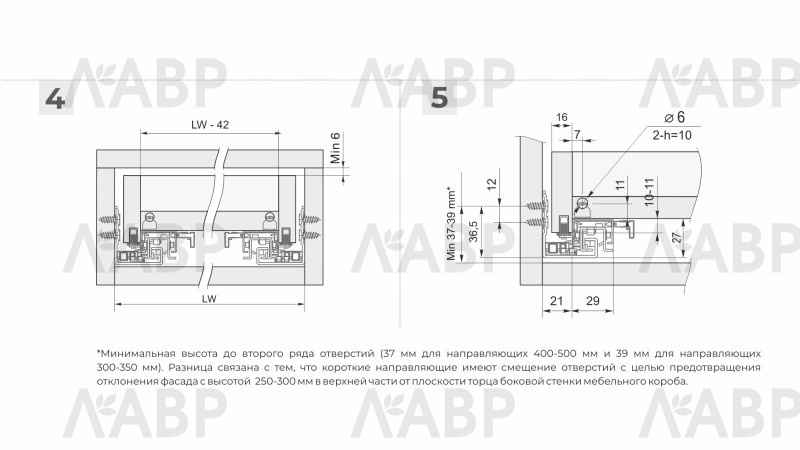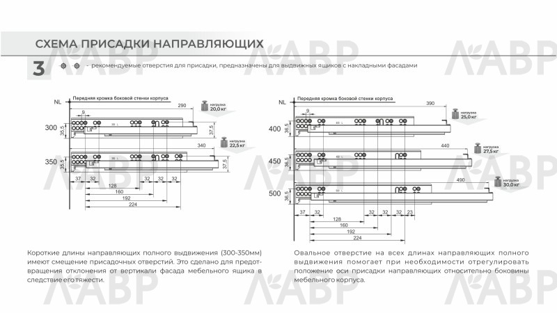 В коротких длинах направляющих DB8783 (250-350 мм) предусмотрено смещение оси присадочных отверстий. Это обеспечивает точное и плотное прилегание фасадов к боковинам мебельного корпуса, даже если неглубокий выдвижной ящик устанавливается с габаритными, высокими фасадами.
