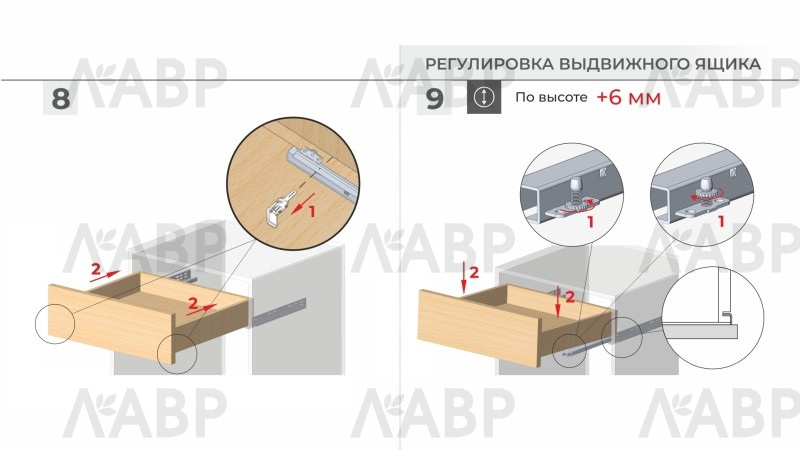 DB8783 — базовые направляющие скрытого монтажа полного выдвижения с плавным доведением и выверенным набором опций и возможностей для мебельных производителей. Это направляющие насадного монтажа с цапфой, которая обеспечивает регулировку положения фасада по вертикали до 6 мм.